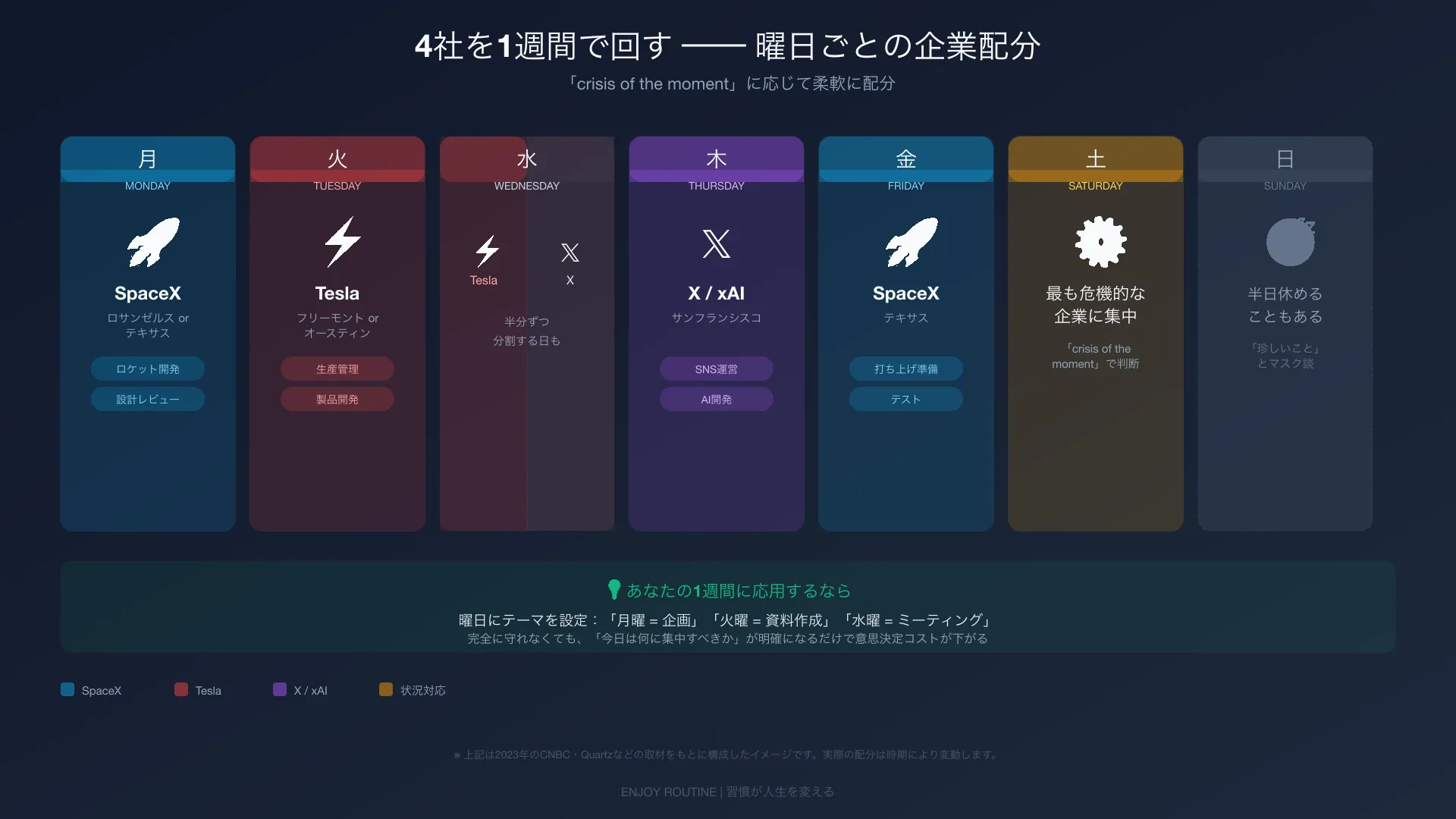 マスクの時間術で最も独特なのが、曜日ごとに担当企業を切り替えるというアプローチだ。