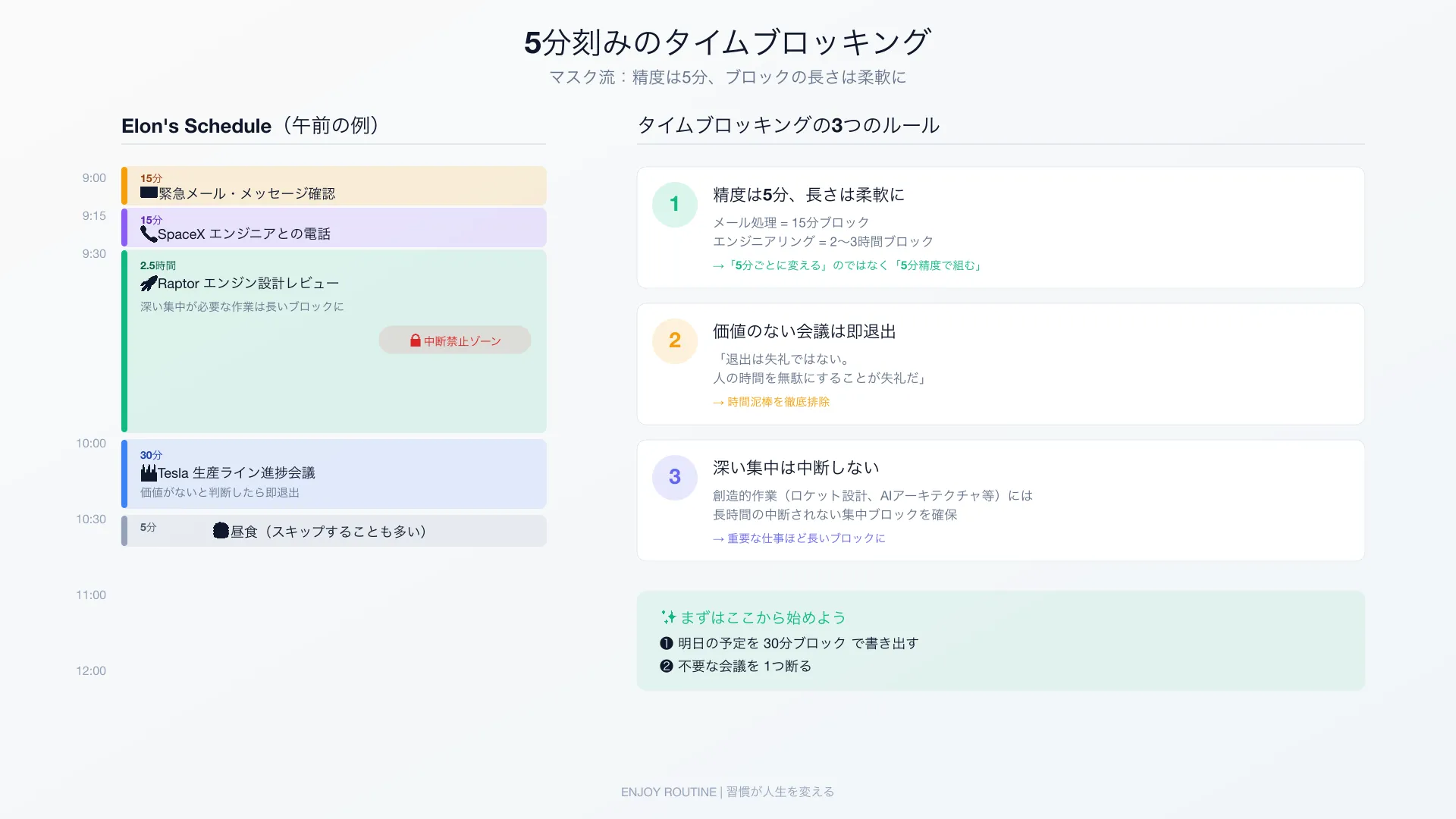 タイムブロッキングとは、1日をあらかじめ時間のブロックに分割し、各ブロックに特定のタスクを割り当てる手法だ。マスクの場合、そのブロックが5分単位——メールチェックに15分、Teslaの設計レビューに45分、食事に5分、といった具合だ。