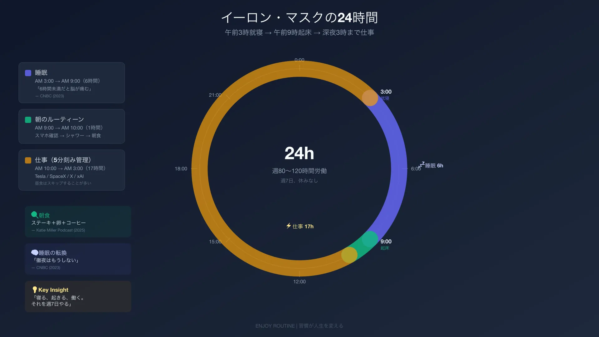 就寝は午前3時頃、起床は午前9時頃。「徹夜はもうしない」と宣言し、睡眠の質が意思決定の質に直結することを認めた。