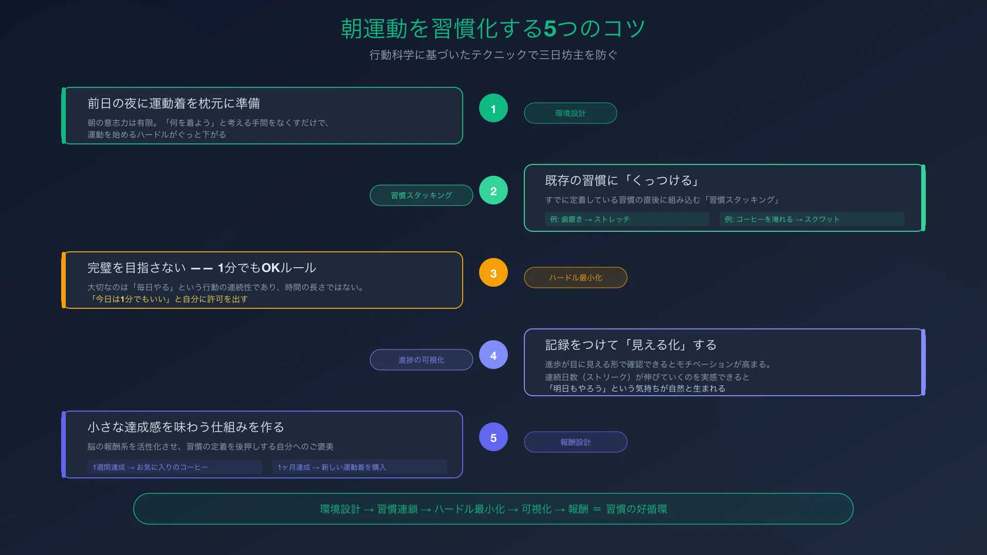 どんなに効果のある運動でも、続かなければ意味がありません。ここでは、行動科学に基づいた習慣化のための5つのテクニックを紹介します。