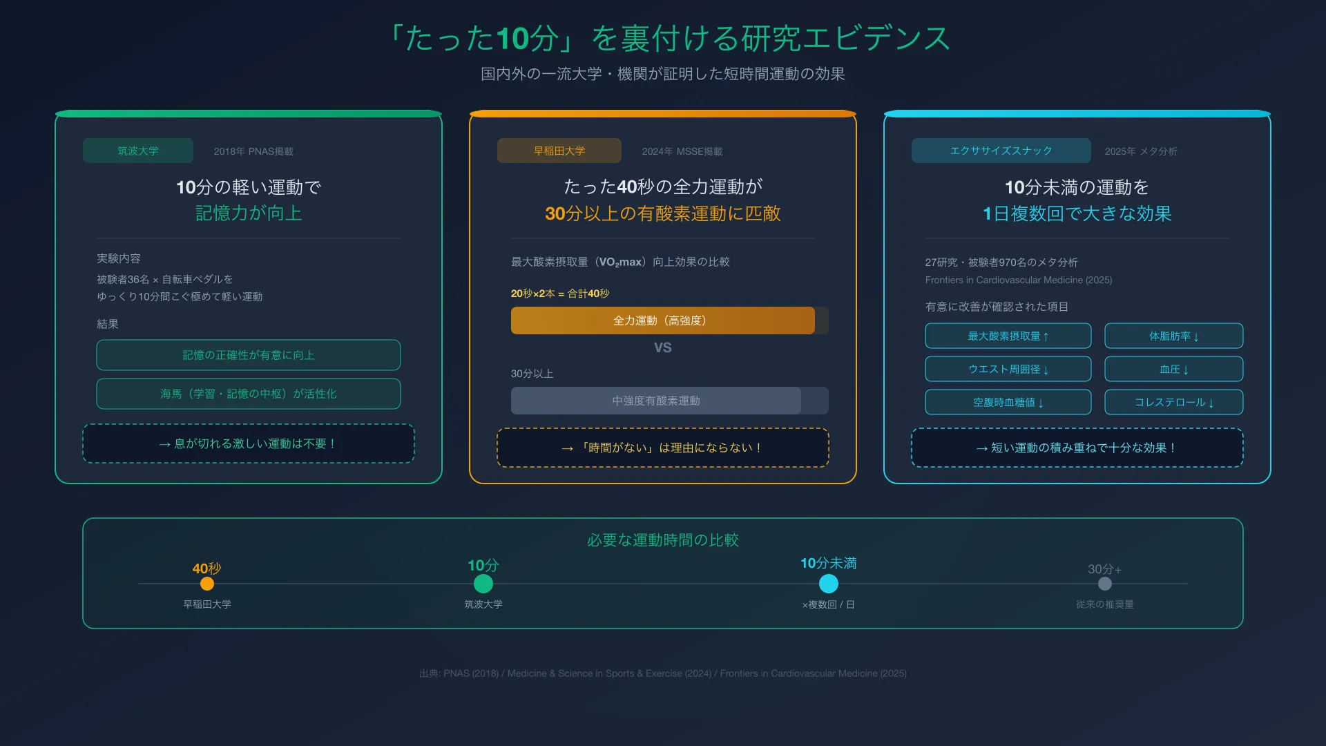 「朝の運動が良いのはわかった。でも10分で本当に意味があるの?」——そう思う方もいるでしょう。実は、短時間の運動にも確かな効果があることが、国内の一流大学の研究で次々と明らかになっています。