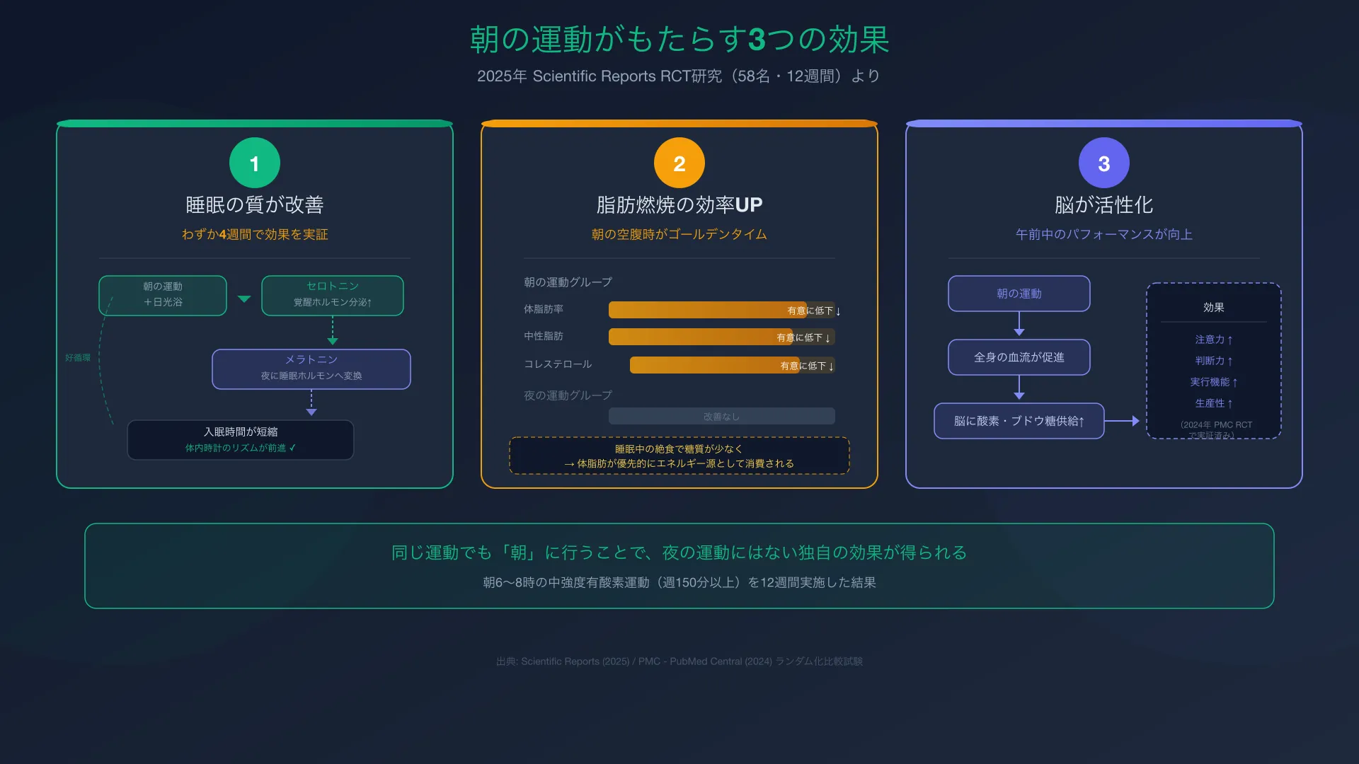 本記事で紹介した最新の科学研究が示すのは、「朝のたった10分の運動でも、睡眠の質・脂肪燃焼・脳の活性化に確かな効果がある」という心強い事実です。
