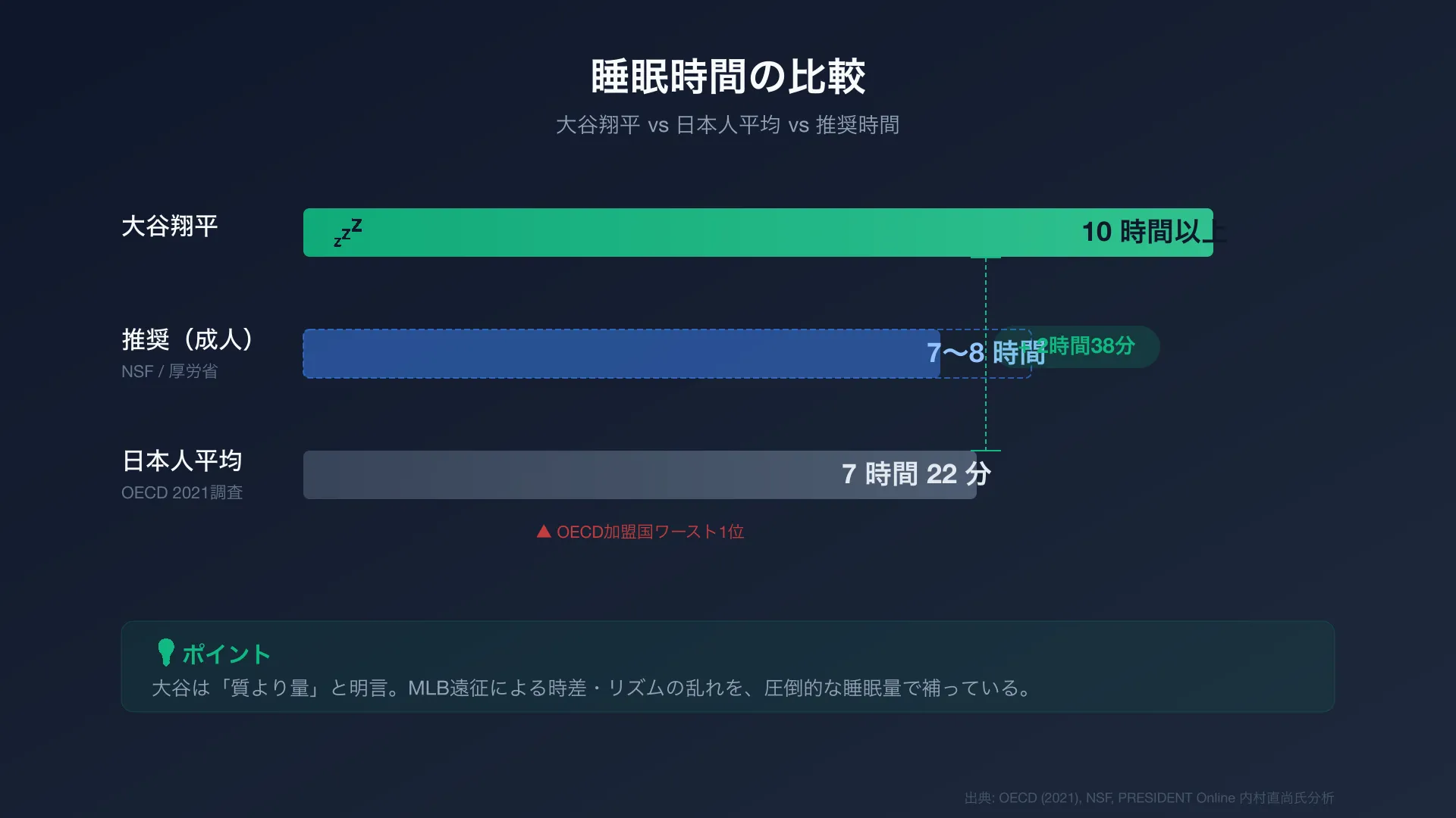 2023年5月、Full-Countの取材に対してこう語っている。睡眠の専門家がよく「質が大事」と語る中で、大谷のアプローチは一見すると逆張りにも見える。